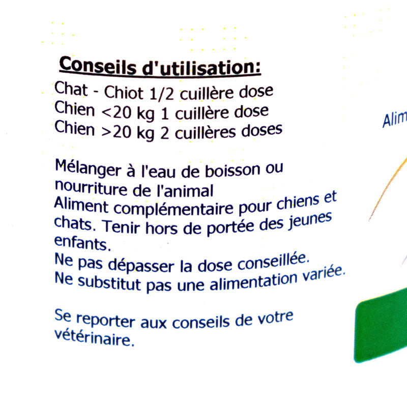 Complément alimentaire pour chiens et chats. 100% naturel, qualité des ingrédients garantie de consommation humaine....